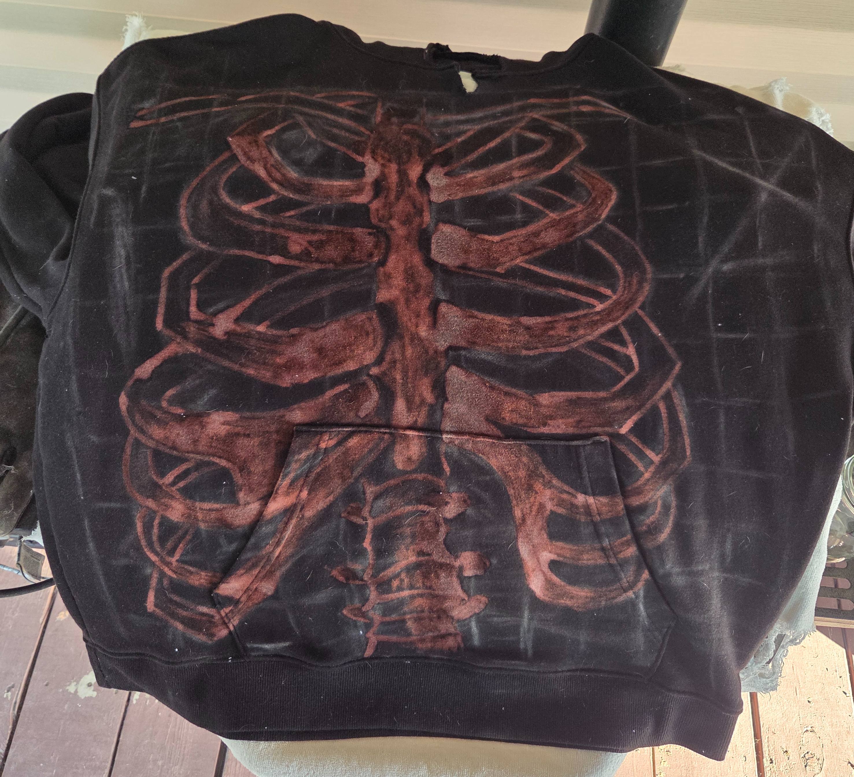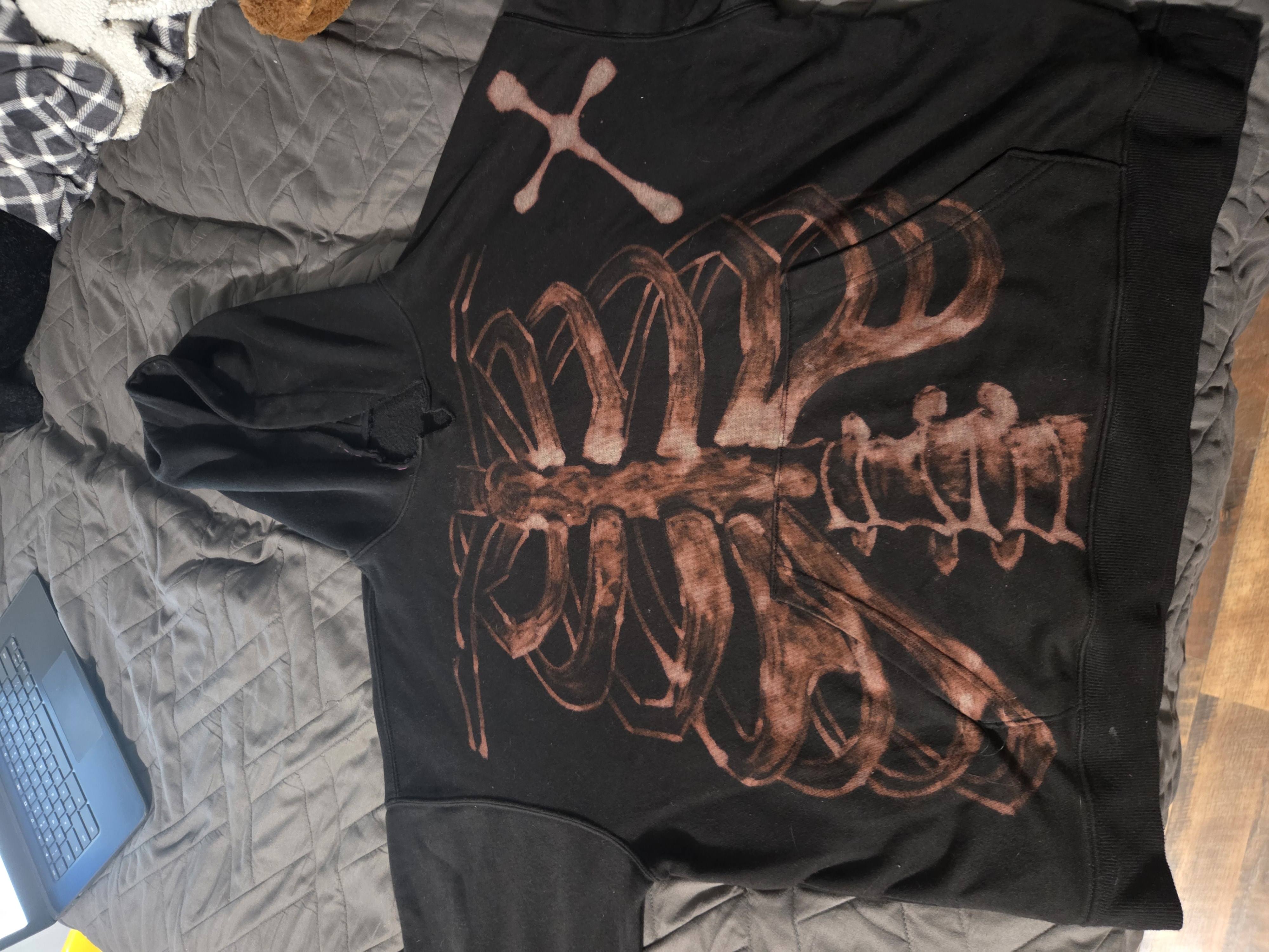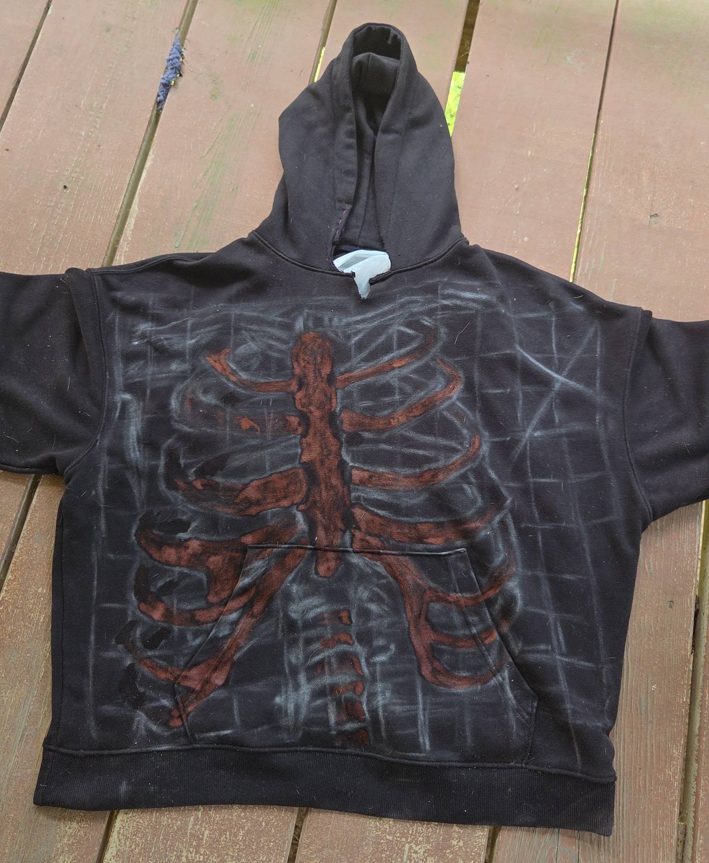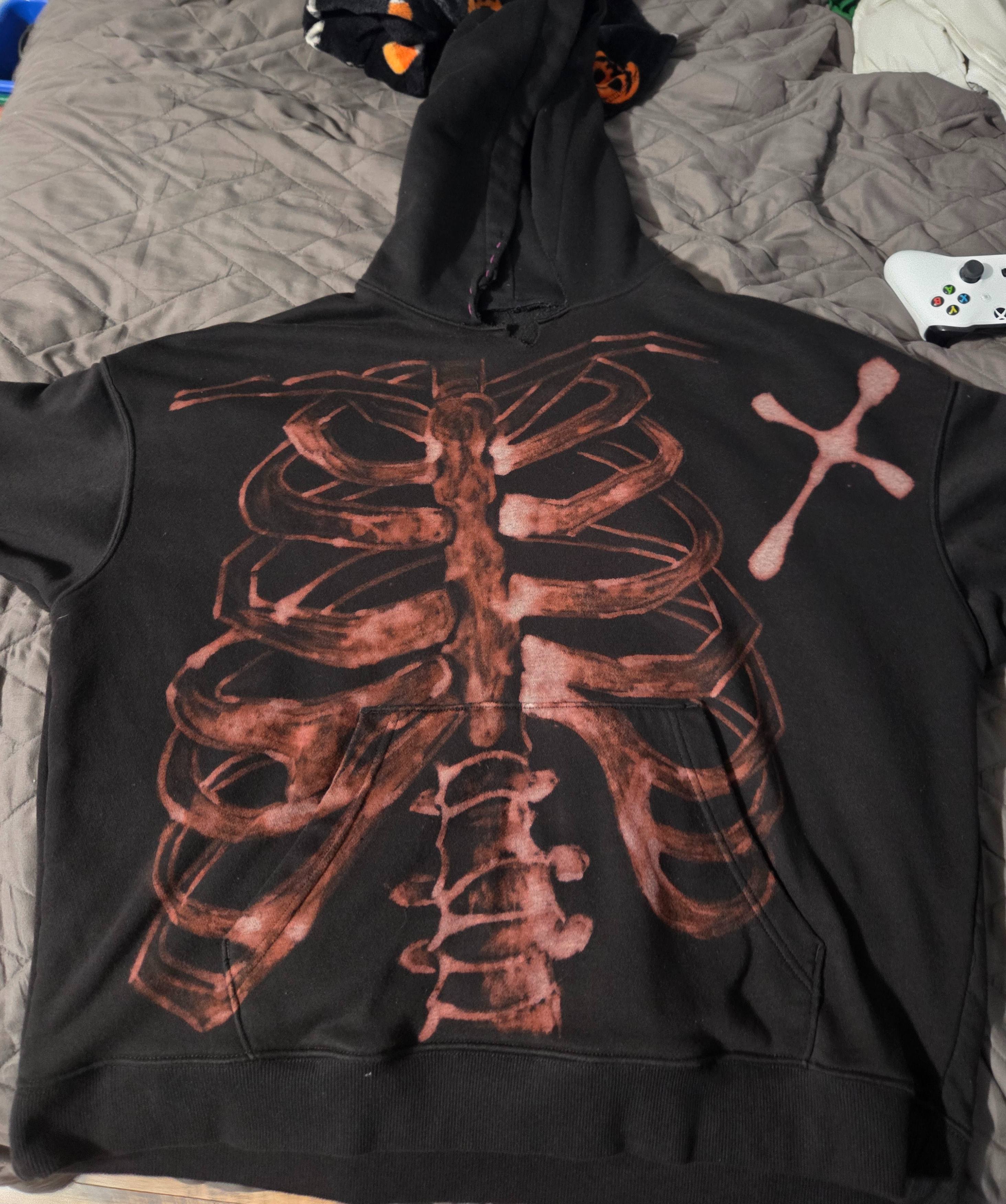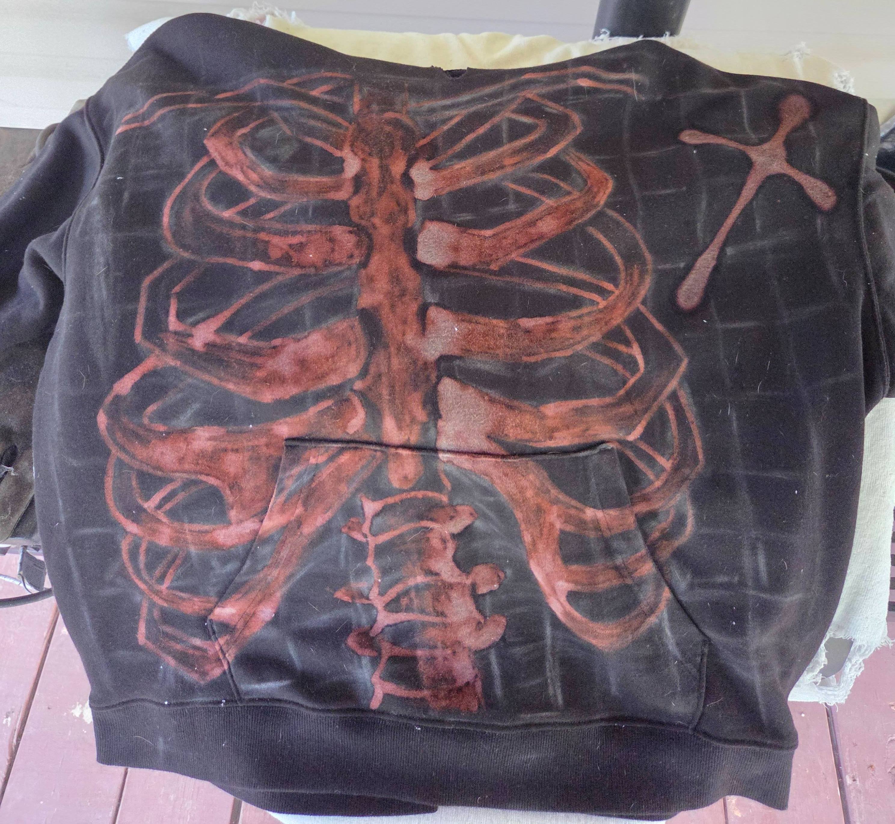 I spent the day bleaching. I layed the hoodie out and put a towel covered by a trash bag inside of the hoodie to prevent bleeding, and I made sure that wherever I was bleaching, it was over the bag. I used jars with different ratios of water and bleach, mainly, 50%, 75%, and 100% bleach. I decided to put a cross in the awkward space left by my snafu with the positioning. I tried to bleach the right side more heavily to make a shading effect, and I think it turned out well. After letting it sit and giving it a wash, this was the final result!