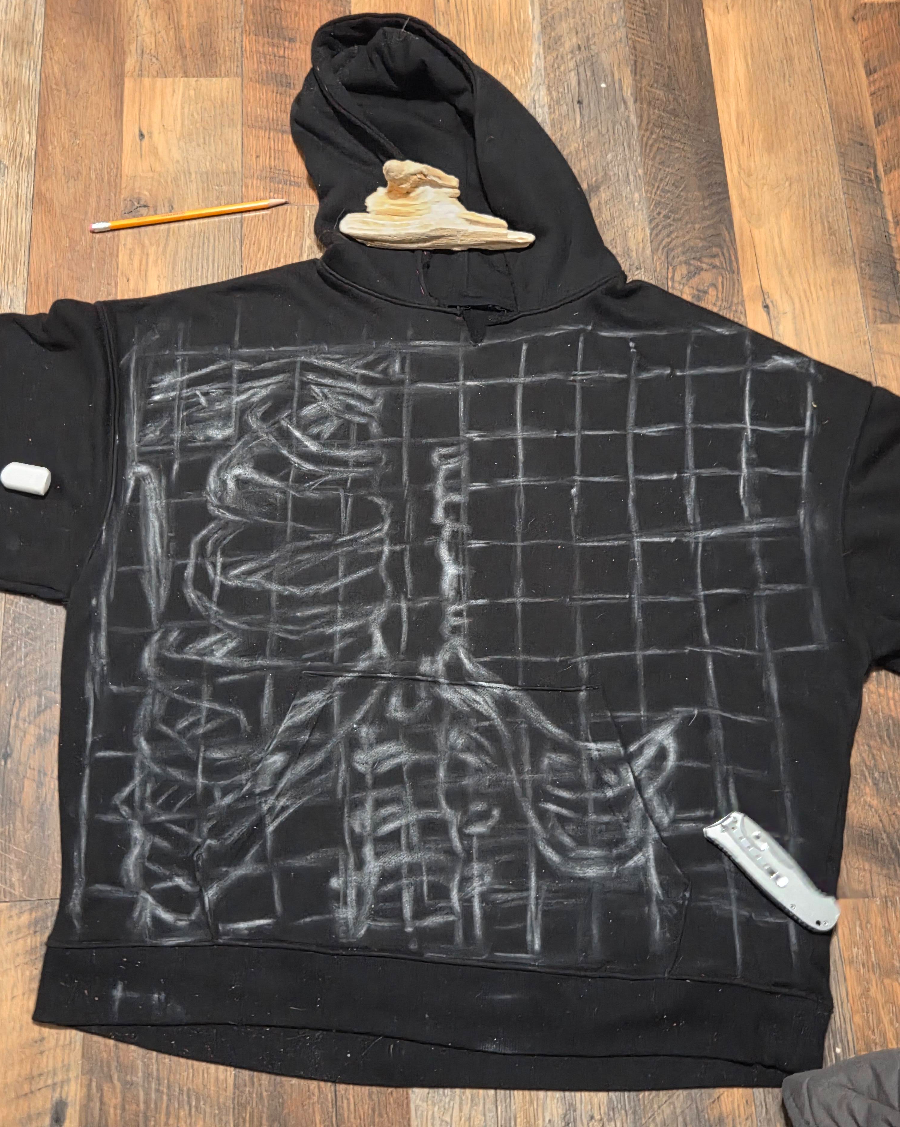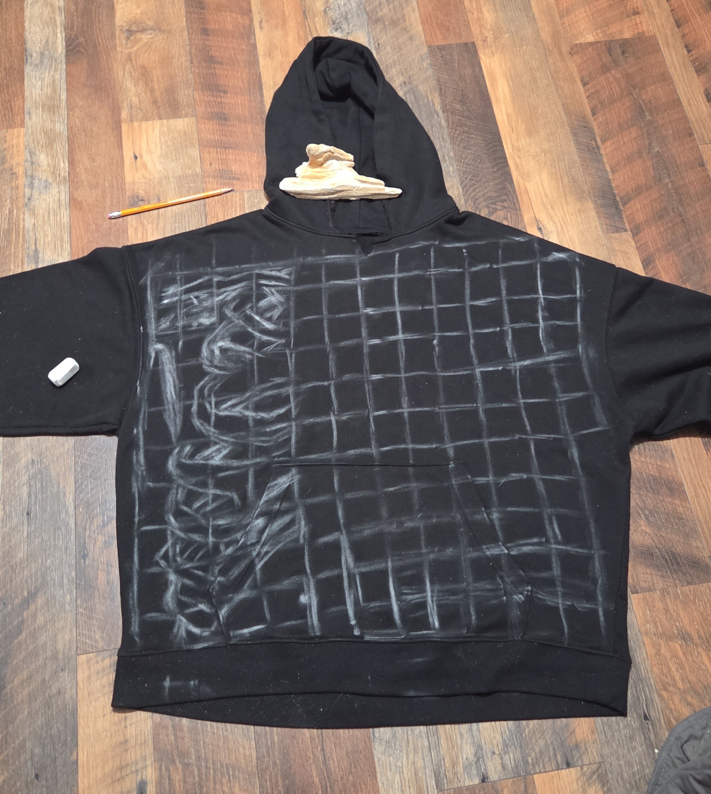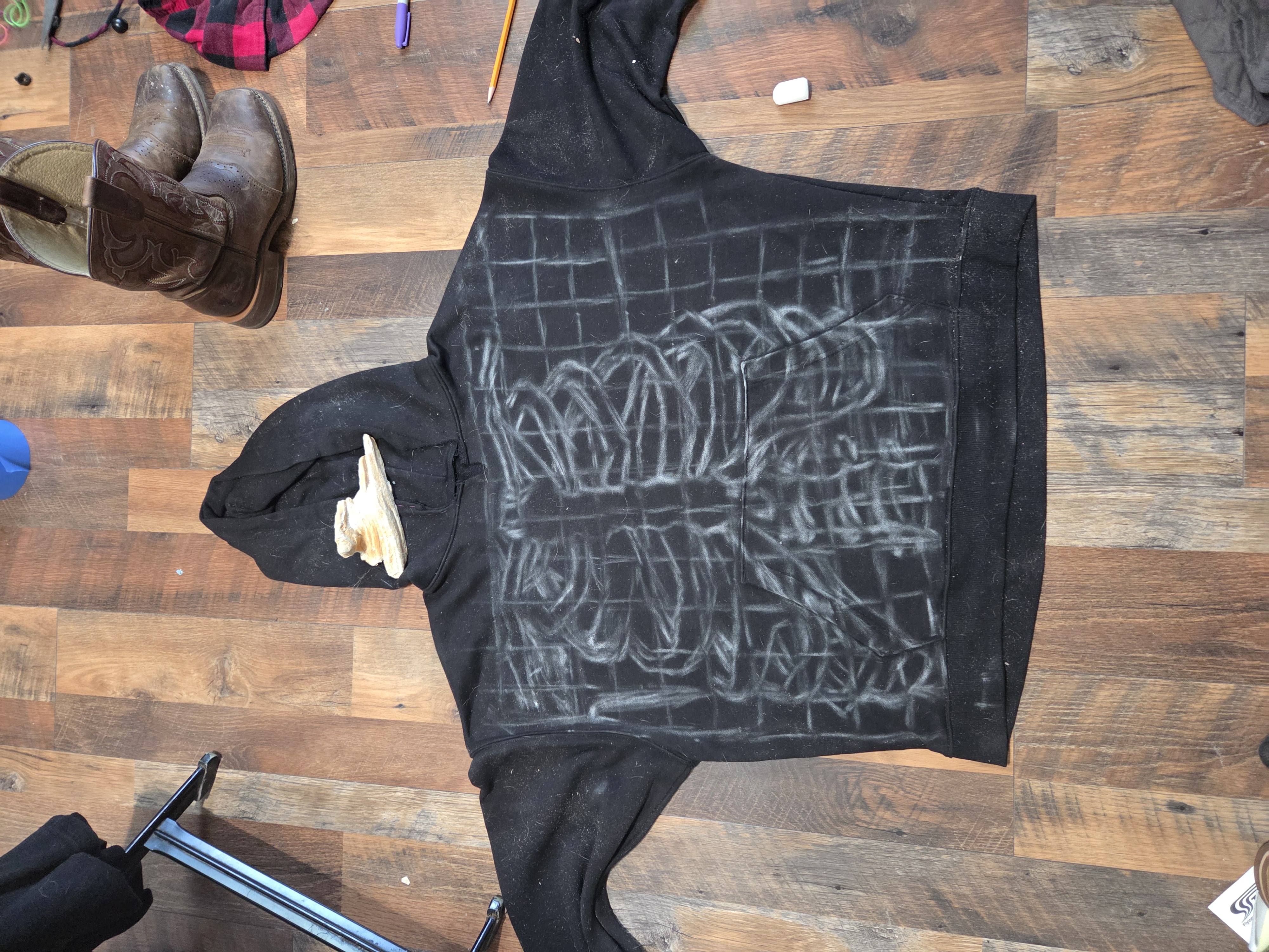 I followed a YouTube tutorial in which they showed off a really cool hack for drawing from references. I found my reference and put it into an mobile app literally called "Grid Maker for Drawing"; this way, instead of trying to draw an entire reference, you can focus on referencing each tile one-at-a-time to more accurately draw the full image. I layed out the hoodie and used chalk to draw the grid and began the vary tedious process of copying each tile. In hindsight, I should have used a thinner classroom style chalk, but all I had at the time was pavement chalk.